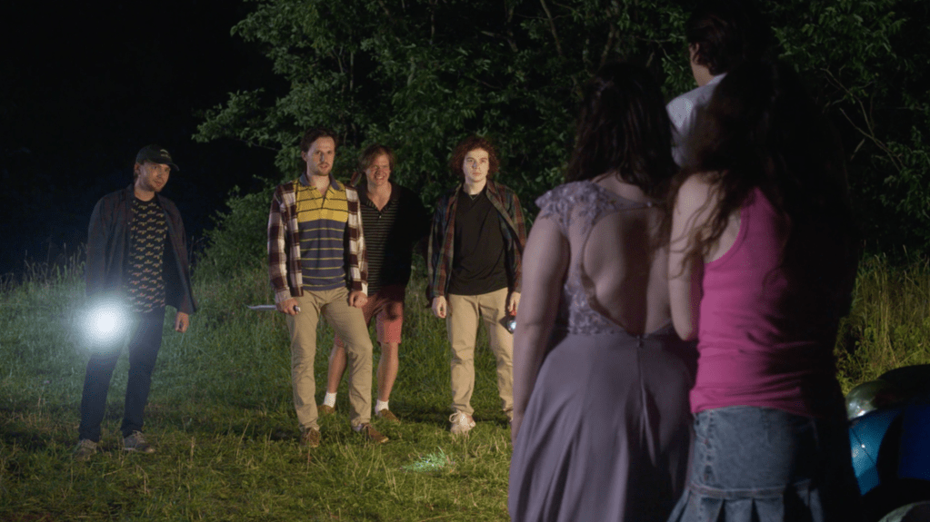 A group of murderous frat boys get more than they bargained for when they cross paths with a couple coming home from a wedding.